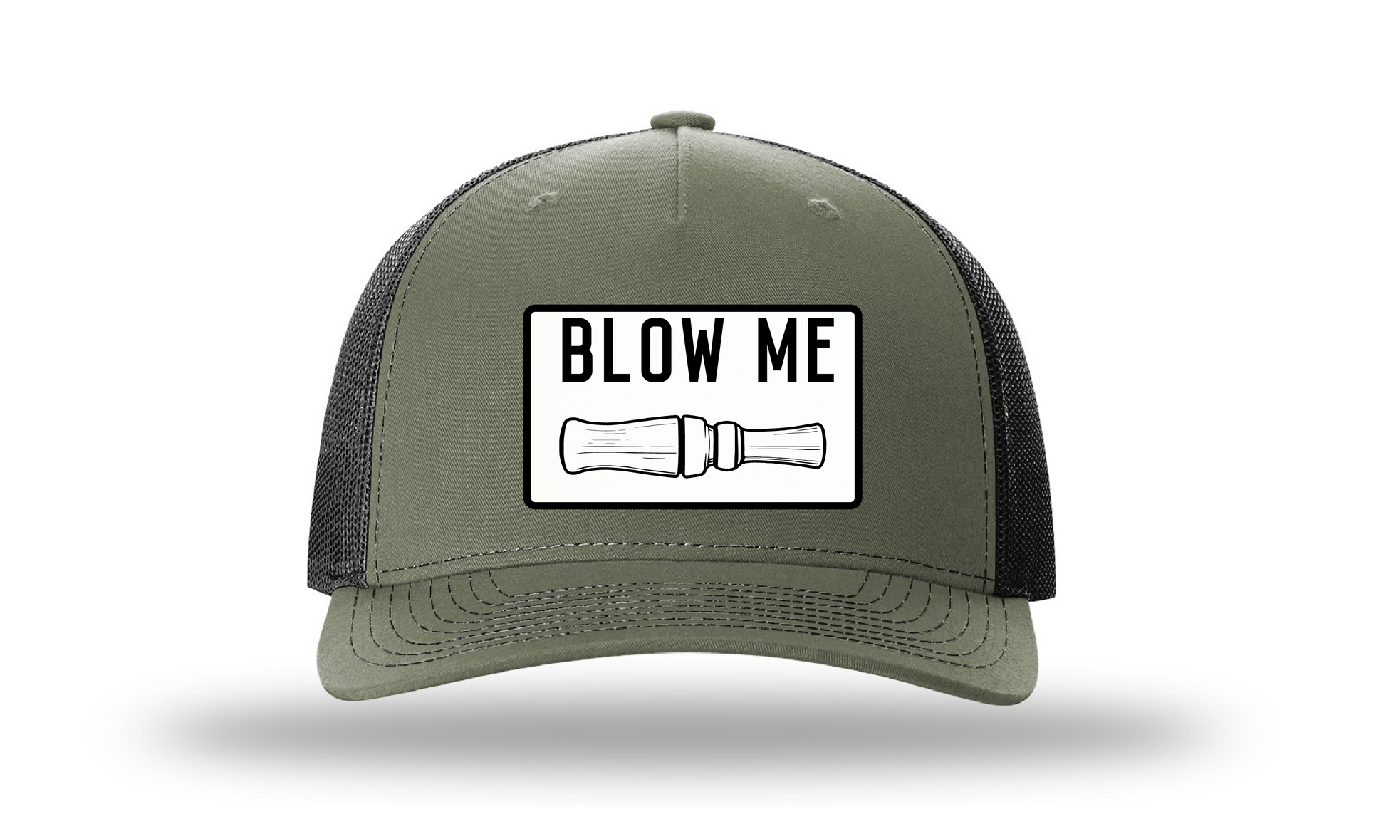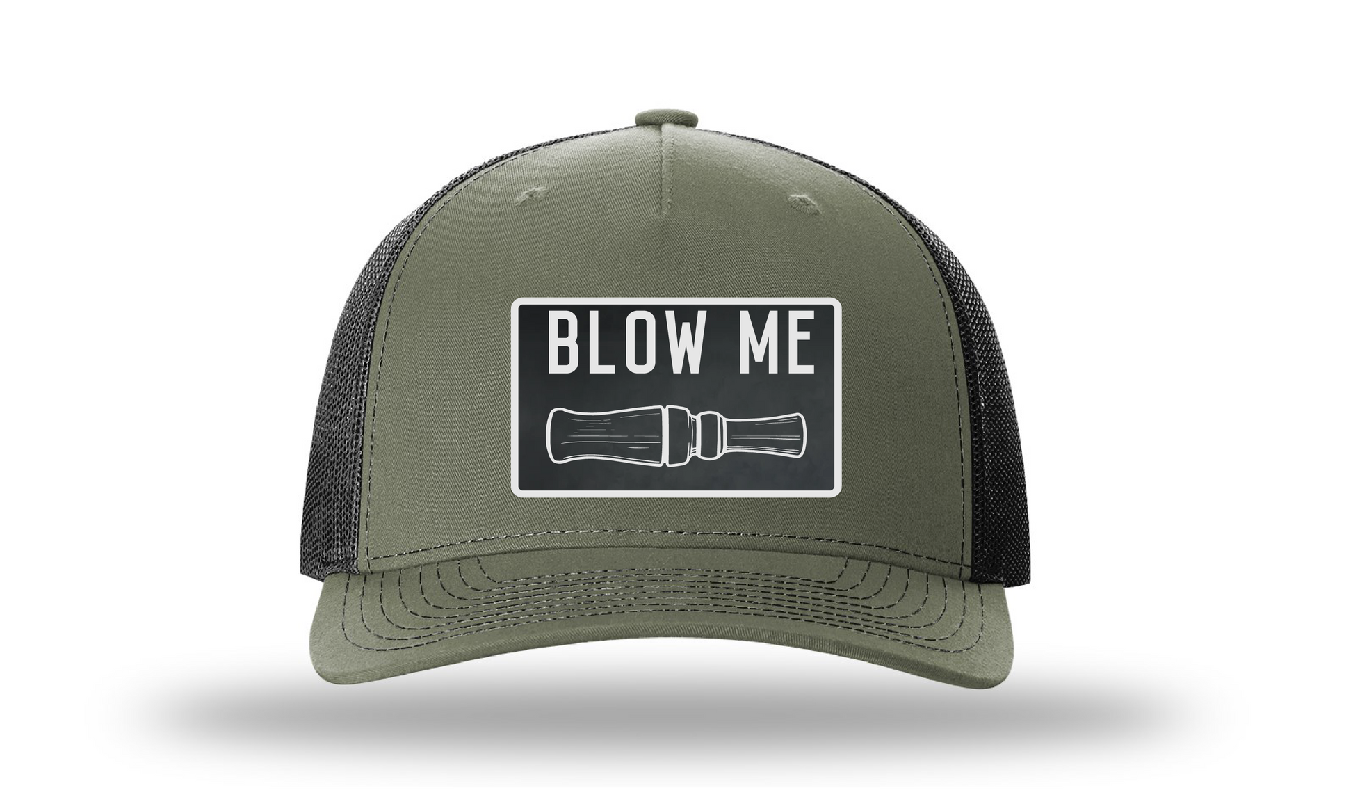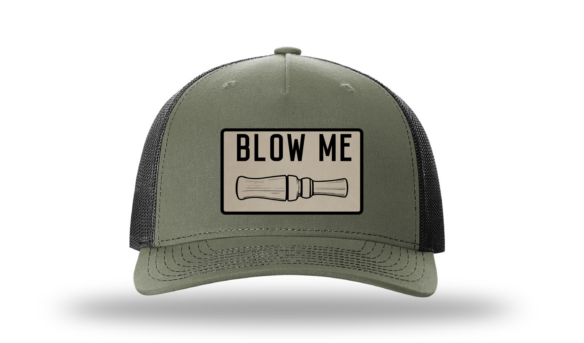 This Richardson 112 5-panel trucker hat features a rugged leatherette patch with a picture of a duck call, accompanied by the playful phrase "blow me" beneath it. Combining classic style with a humorous, outdoorsy vibe, this hat is perfect for hunters, outdoor enthusiasts, or anyone with a sense of humor. Made for comfort and durability, it’s a fun accessory that’s sure to turn heads.